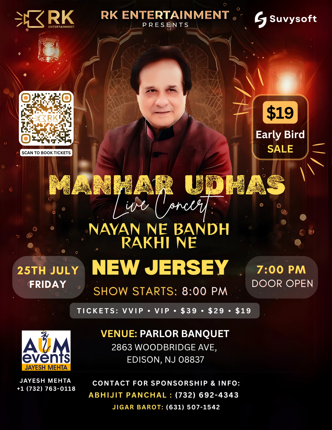 Parlor Banquet 2863 Woodbridge Ave, Edison, NJ, United States✨ Manhar Udhas Live Concert – A Magical Musical Evening in New Jersey! Get ready for an unforgettable night of soul-stirring melodies as RK Entertainment proudly presents a live concert by the legendary Manhar Udhas – the voice that has touched millions of hearts across generations! 📅 Date: Friday, 25th July 2025 🕕 Doors Open: 7:00 PM 🕖 Show Time: 8:00 PM – 10:00 PM 📍 Venue: Parlor … Continue reading Manhar Udhas Concert: New Jersey
